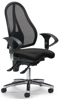 Qualitätsmerkmale: Synchron-Mechanik, Bandscheibensitz, Netzrückenlehne höhenverstellbar, Lendenwirbelstütze, stufenlose Sitzhöhenverstellung, GS-Zeichen, TÜV-geprüft, verchromtes Fußkreuz und lastabhängig gebremste Doppelrollen.